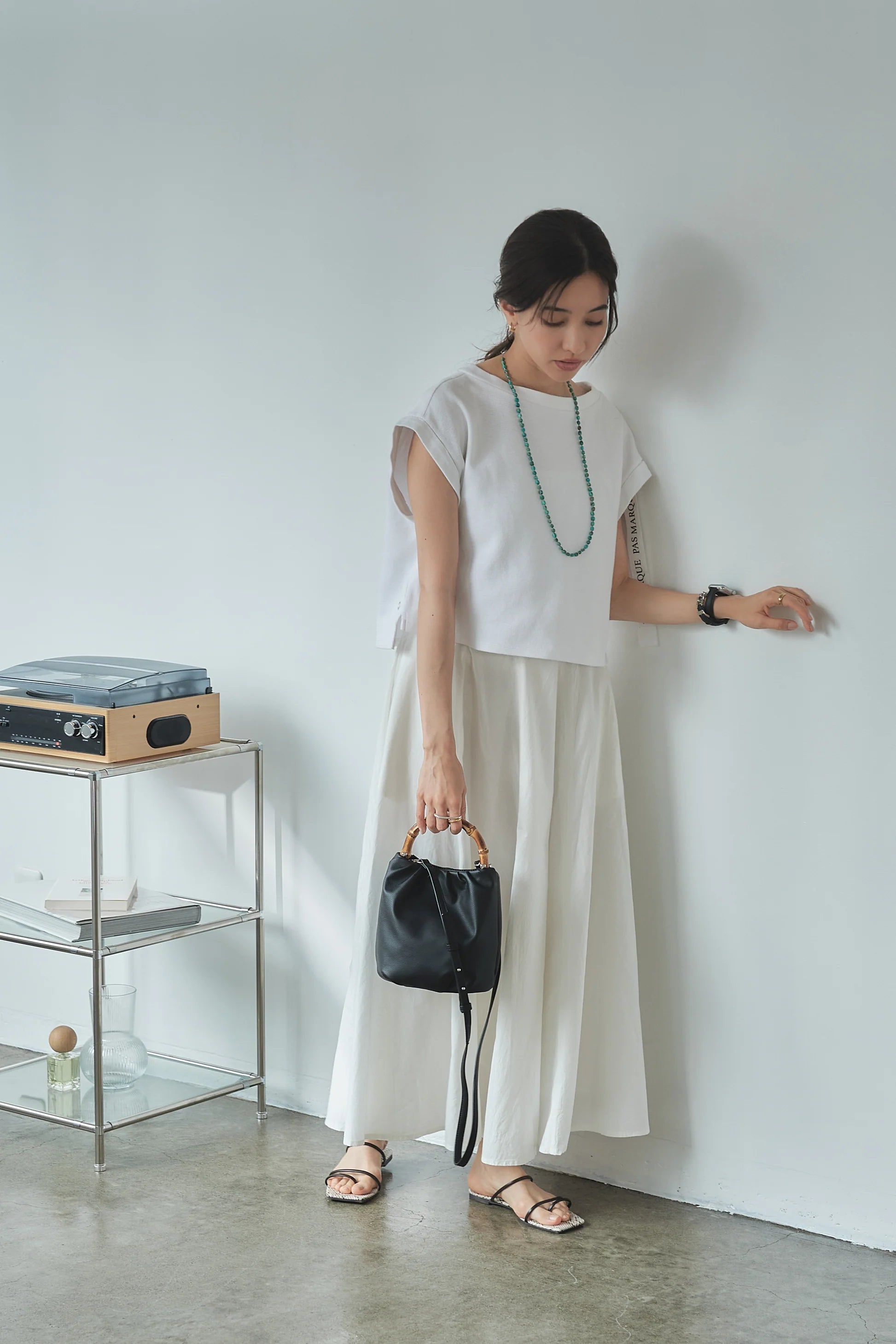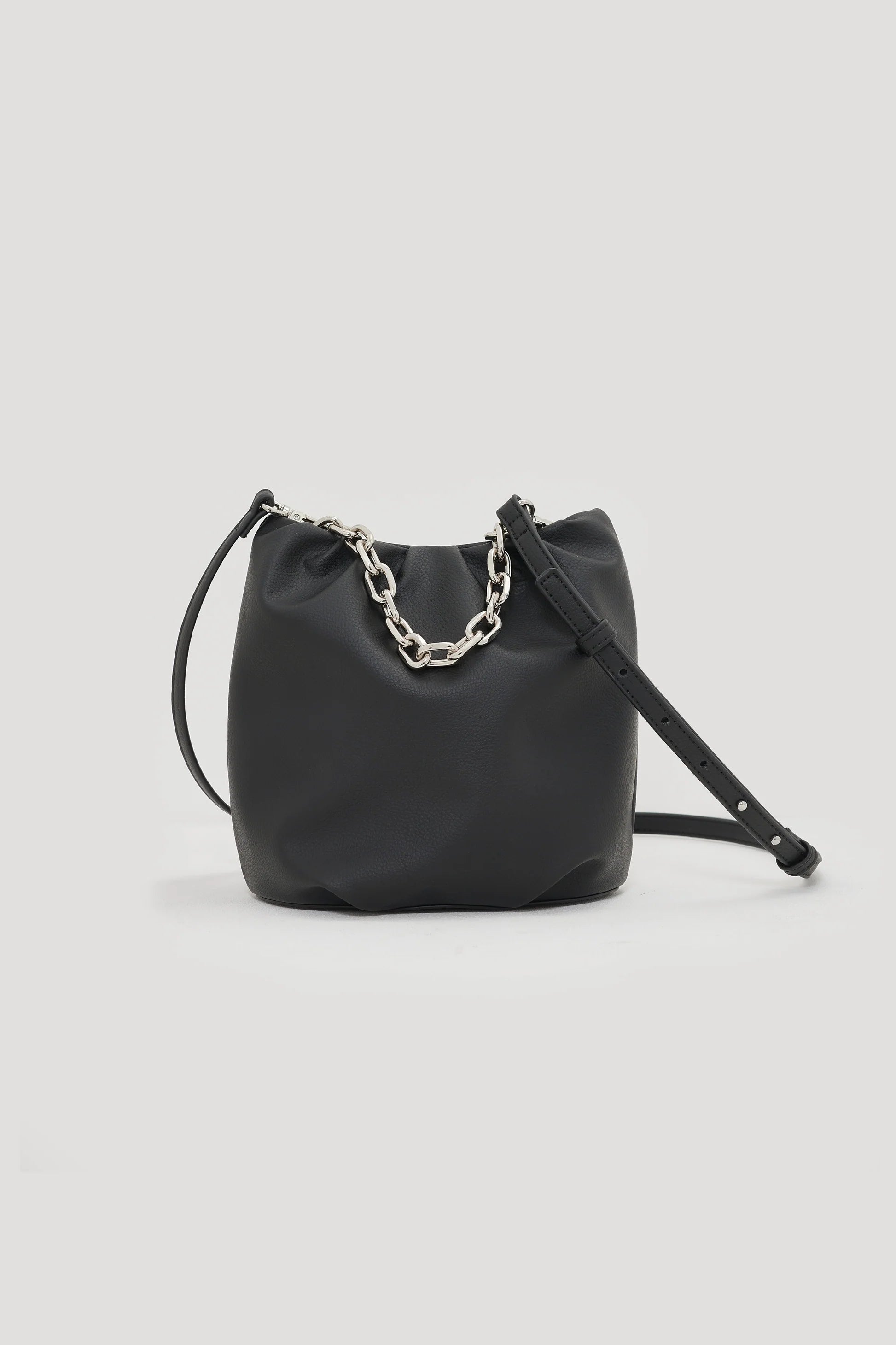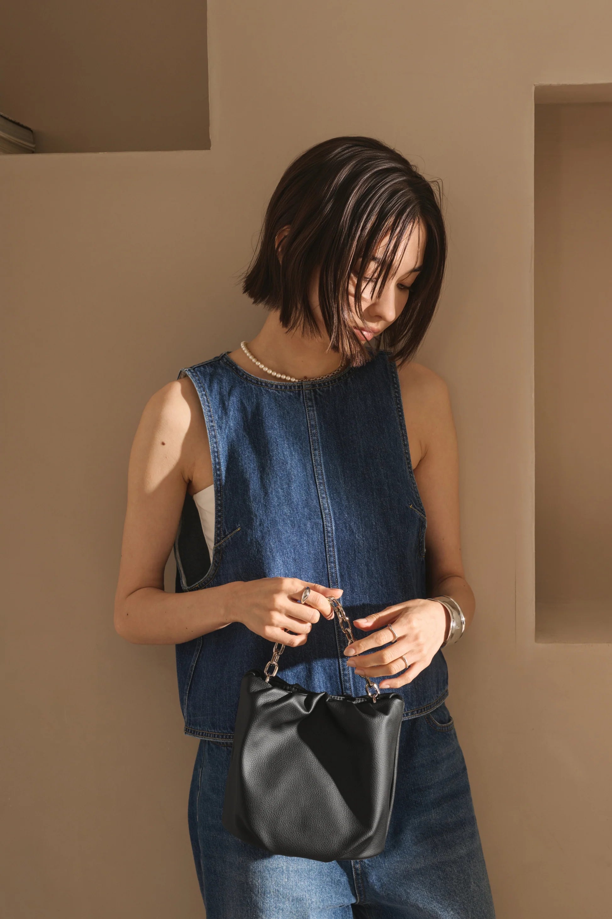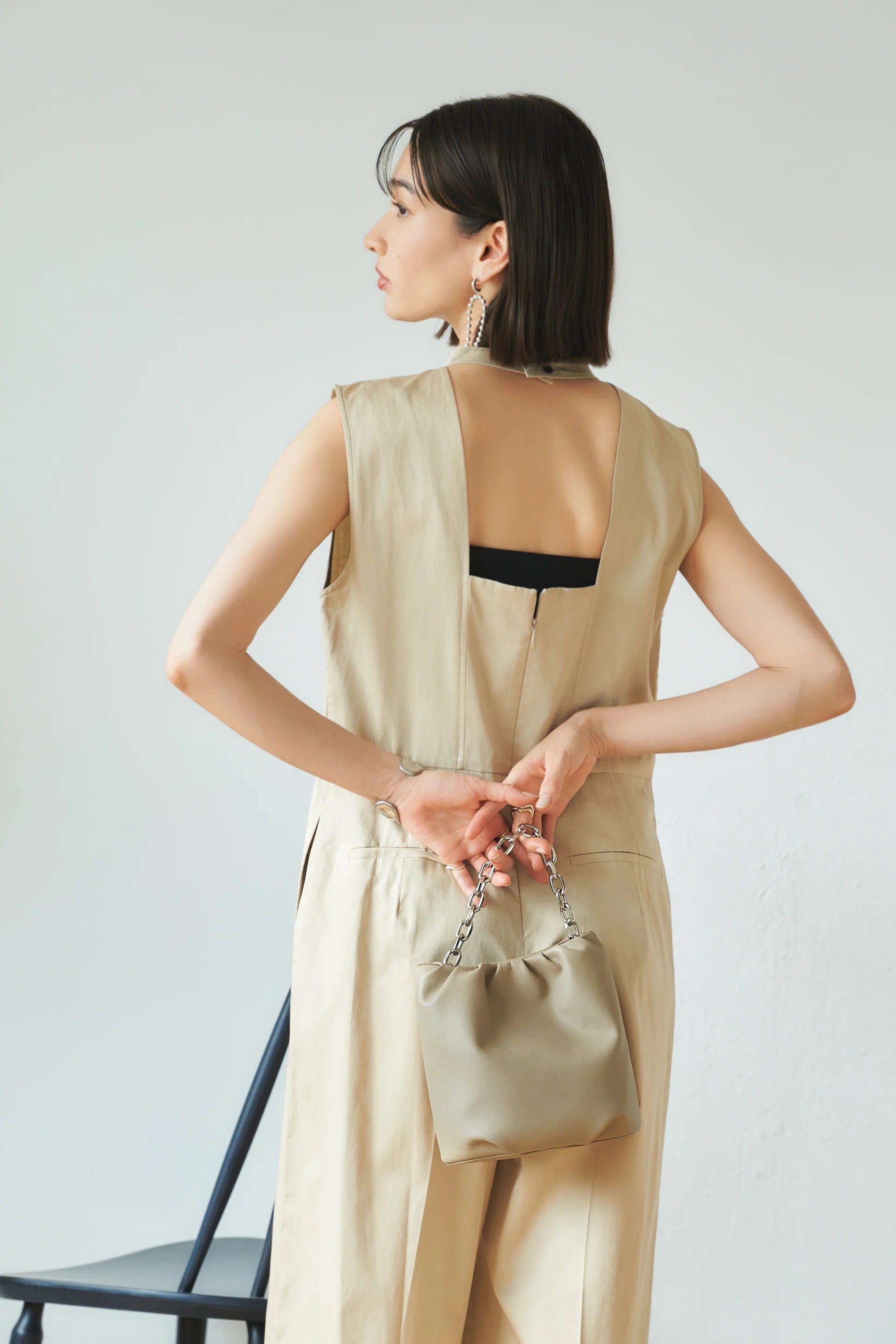 バンブー・チェーンの2種類の持ち手とショルダーストラップ を組み合わせることで、4通りのデザインで使うことができるミニバッグです。