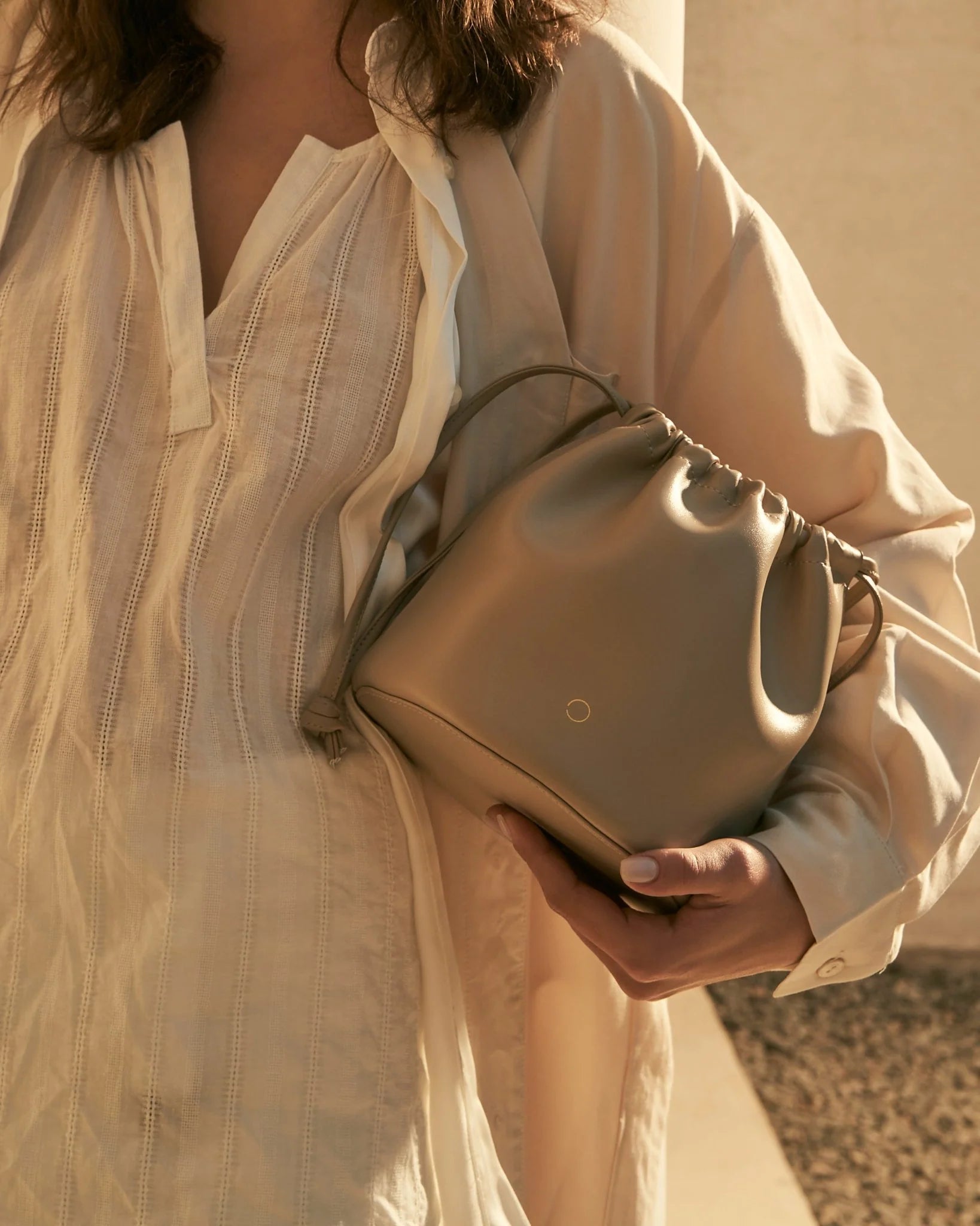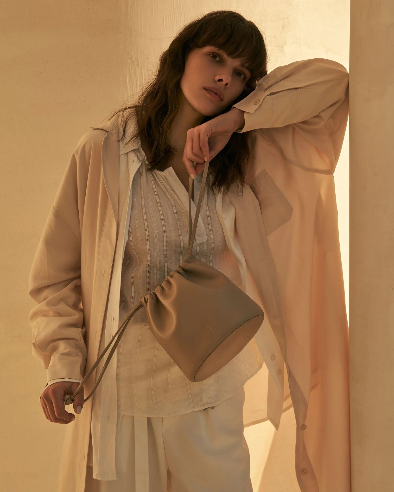 巾着タイプのコロンとした形のバッグです。デザインは非常にシンプルに仕上がっているので、可愛い印象を持ちながら綺麗めなコーディネートにも馴染みやすい優秀なバッグです。