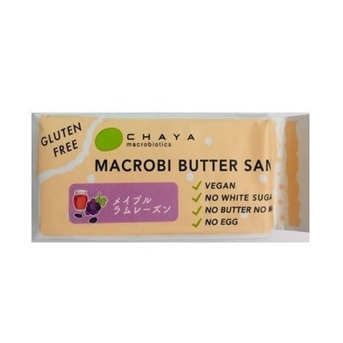 メイプルシロップをプラスした植物性の「マクロビバター」と、ラムレーズンを、米粉と大豆粉で作ったグルテンフリーのクッキー生地でサンドしました。