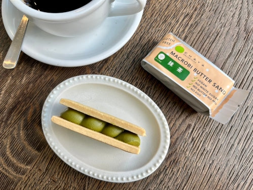 植物性の原材料だけで出来ているとは思えない、本物の「バター」の味わいを感じさせる濃厚な風味と、抹茶の甘苦い味わいがクセになる、ヴィーガン仕様のバターサンド。グルテンフリー。