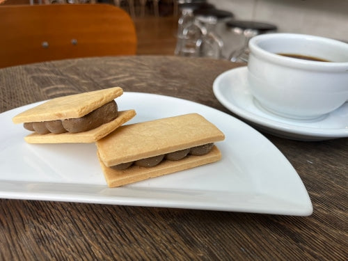 植物性の原材料だけで出来ているとは思えない、本物の「バター」の味わいを感じさせる濃厚な風味と、アガベチョコとコーヒーの甘苦い芳香な味わいが絶妙のヴィーガン仕様のバターサンド。グルテンフリー。