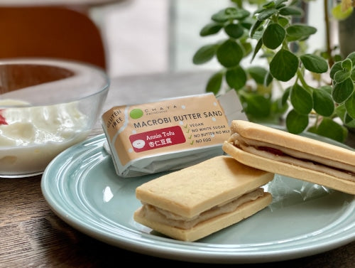 本物の「バター」の味わいを感じさせる濃厚な風味と、まろやかな杏仁豆腐味風味が絶妙のヴィーガン仕様のバターサンド。グルテンフリー。