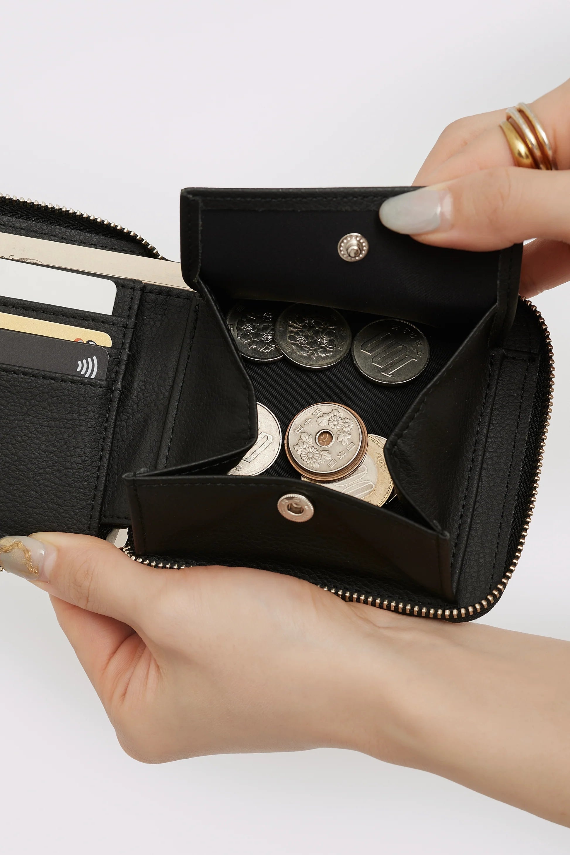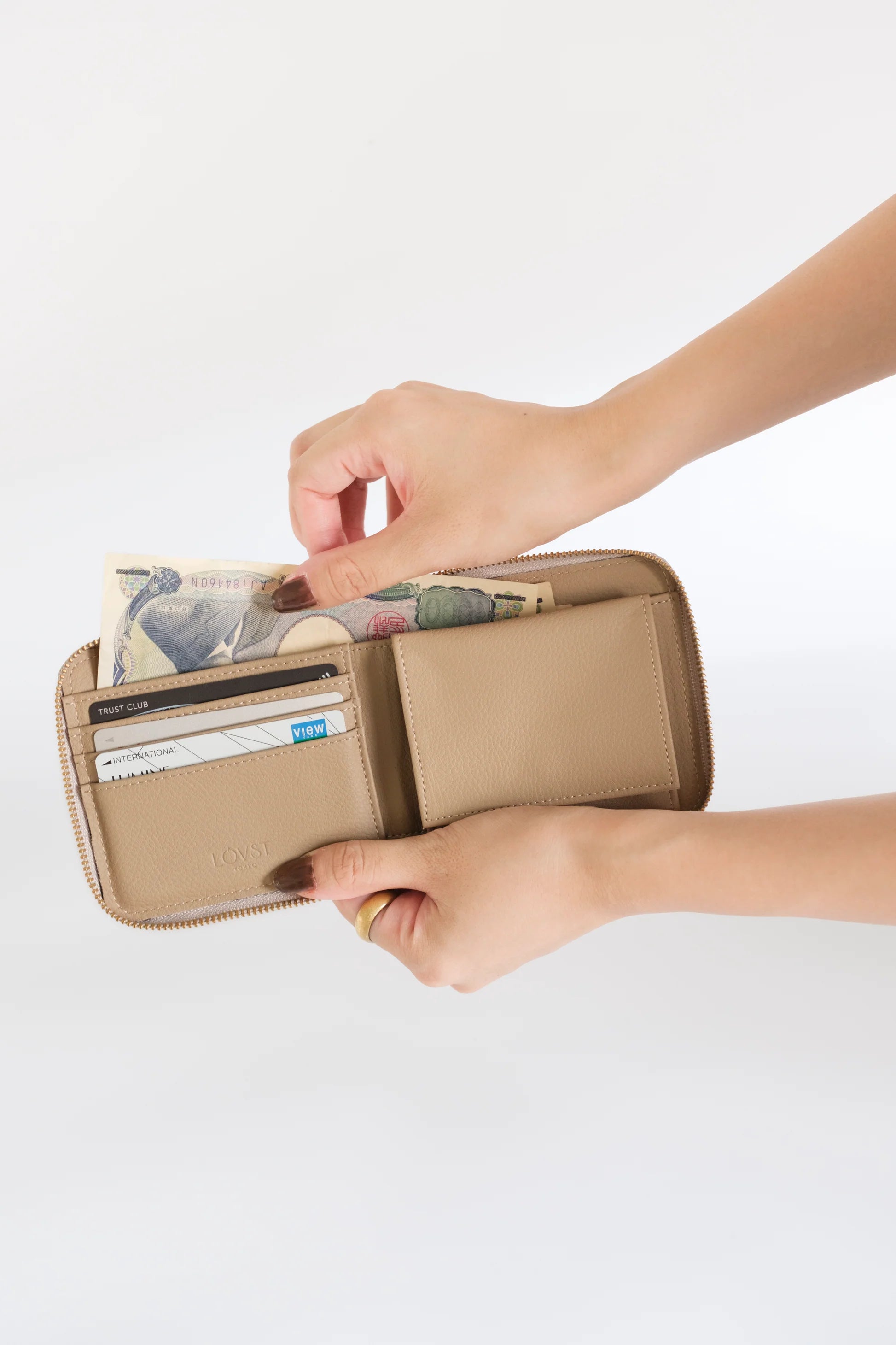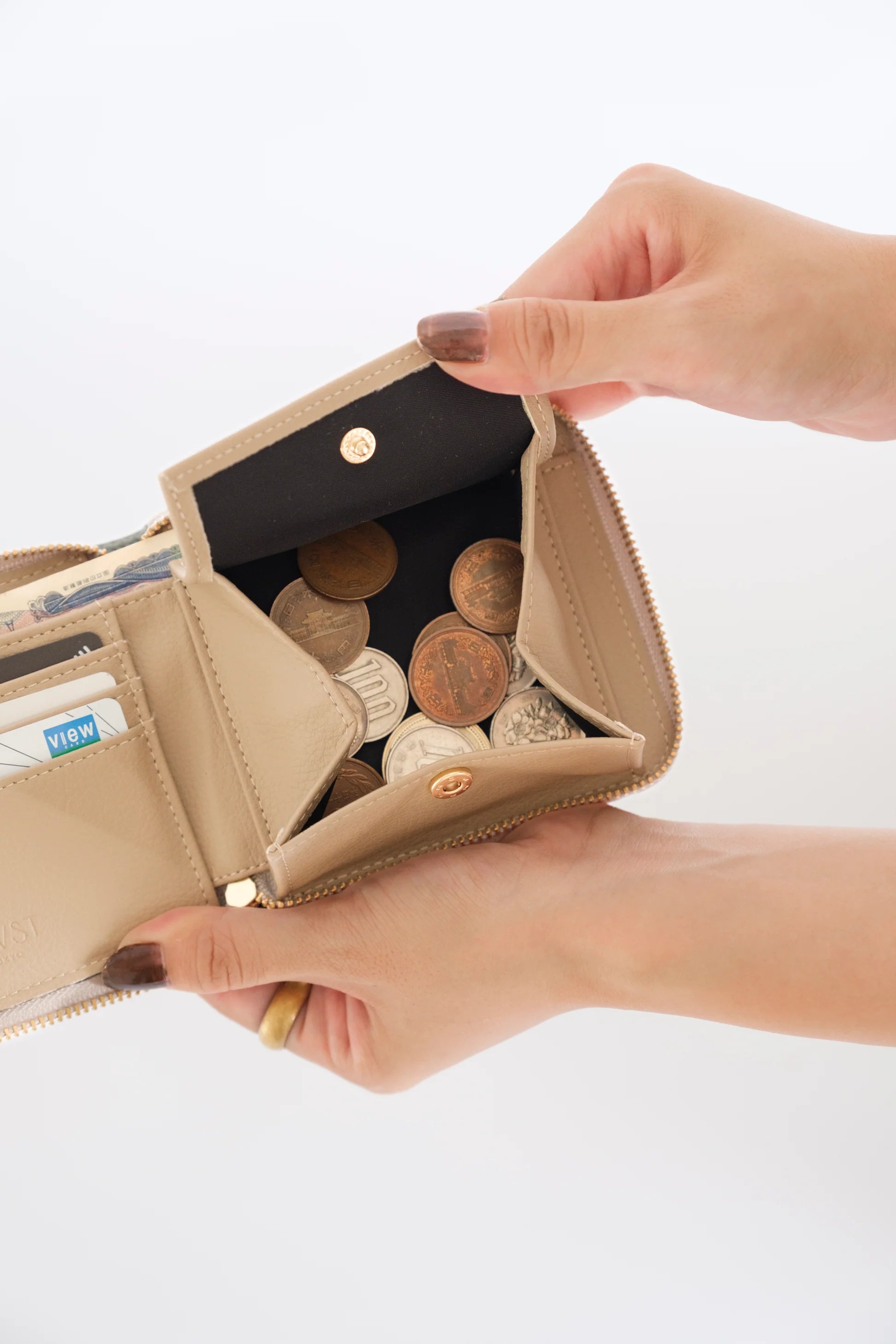 厚みが出てしまいがちな二つ折り財布ですが、極力スリムな形状にこだわり、中身を入れてもポケットやミニバッグに収まりやすい薄手のデザインになっています。