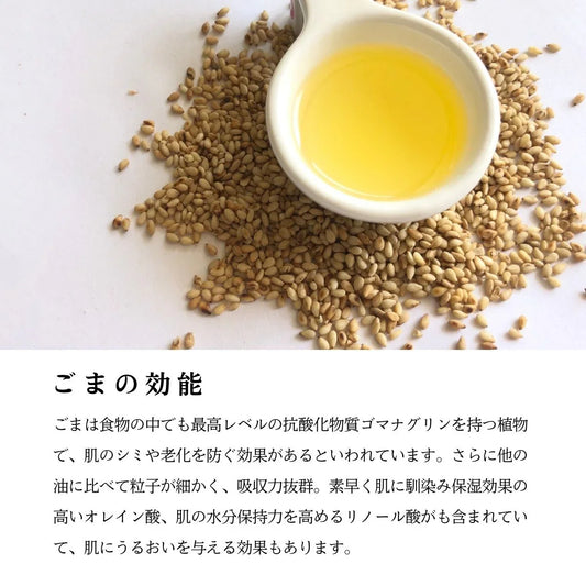 *セサミオイル:昔ながらの圧搾法で一番搾りのみを使用した未焙煎ごま油 エキストラバージンごま油を使用