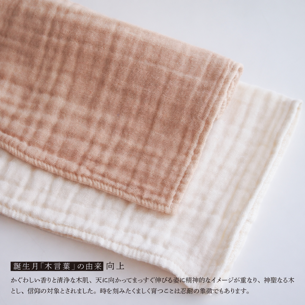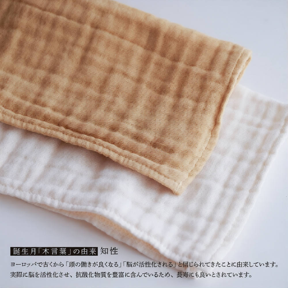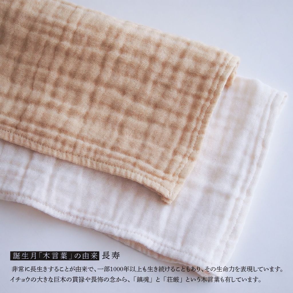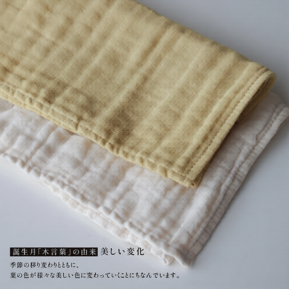 誕生月の木で染めた、ガーゼのハンカチ2枚セット(染色1枚・アイボリー1枚)です。