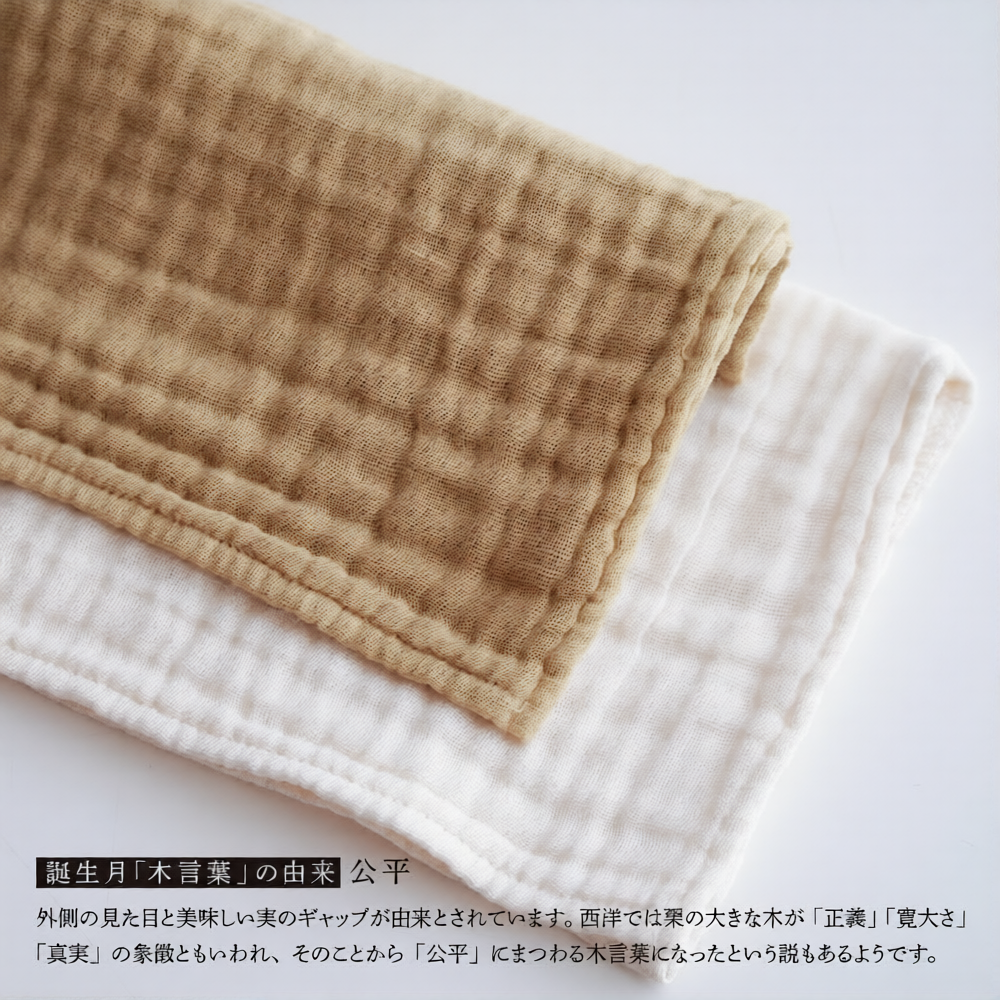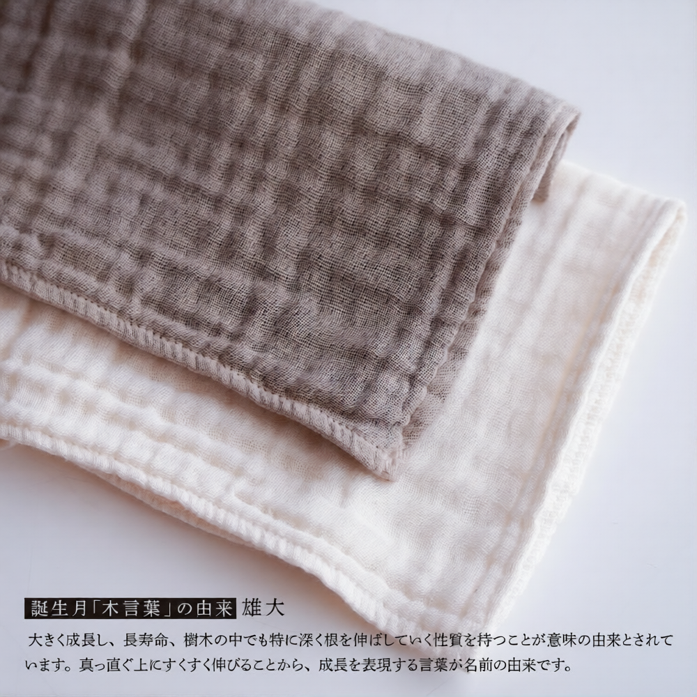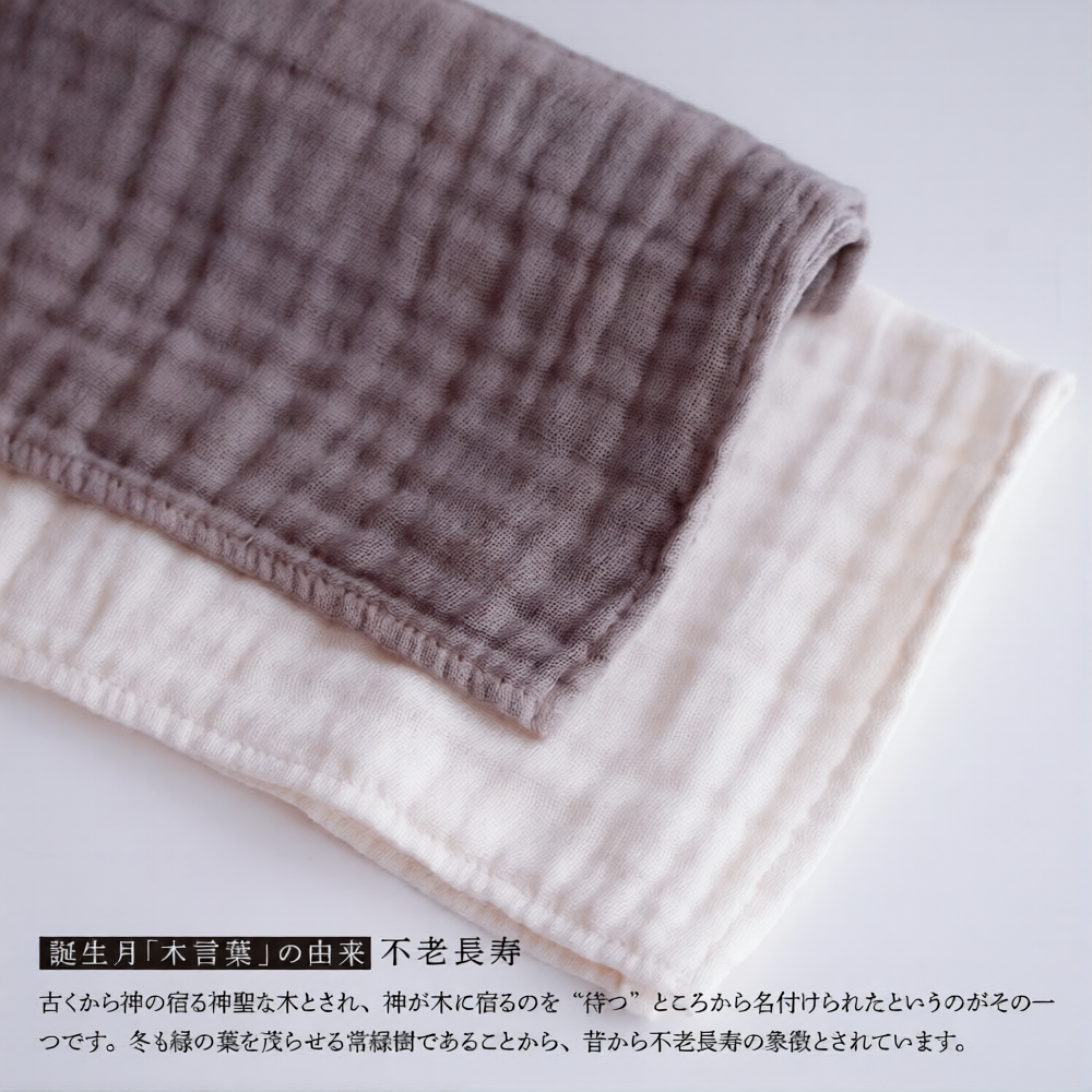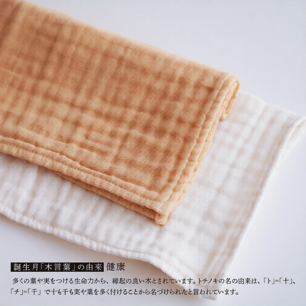 誕生月の木で染めた、ガーゼのハンカチ2枚セット(染色1枚・アイボリー1枚)です。