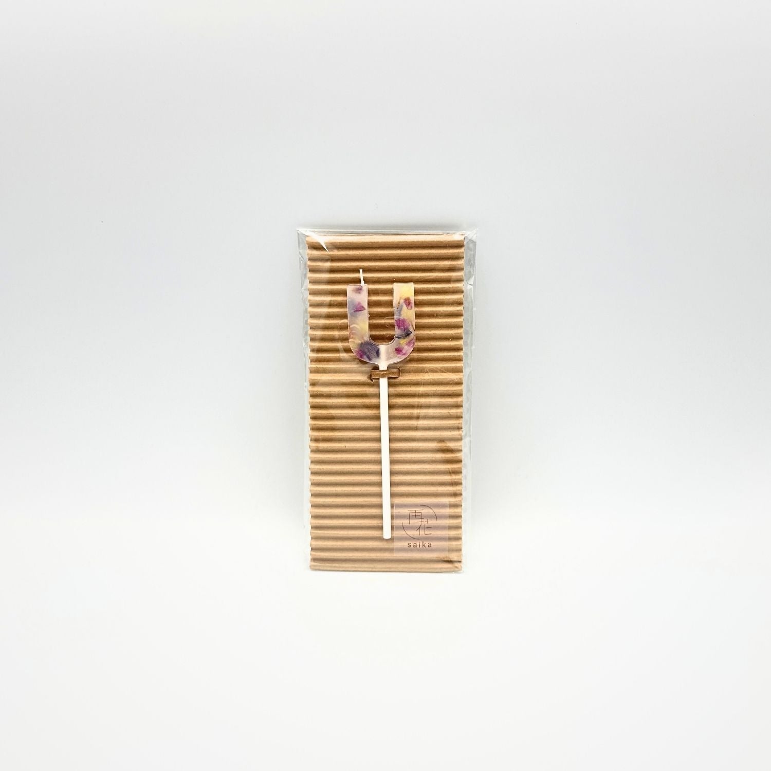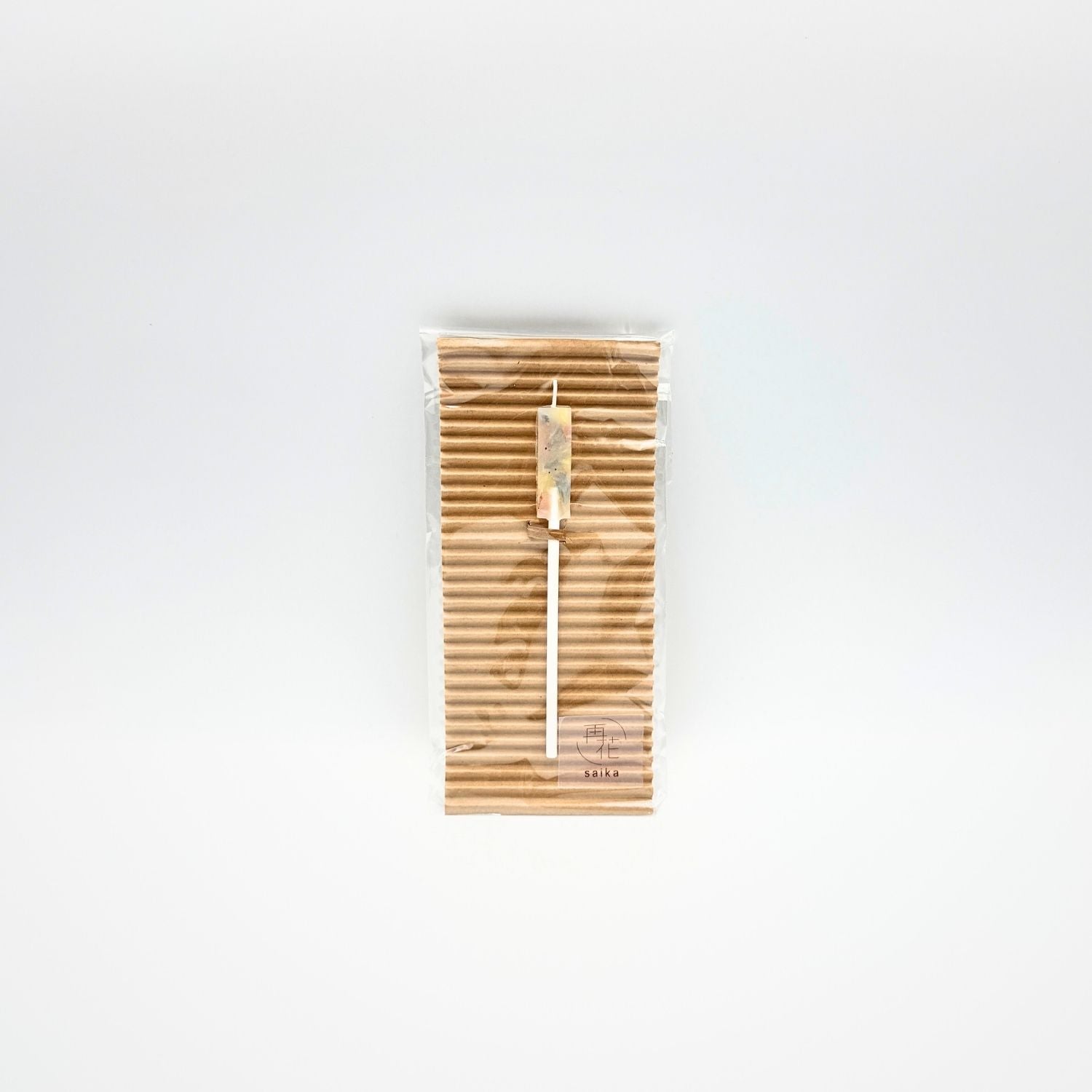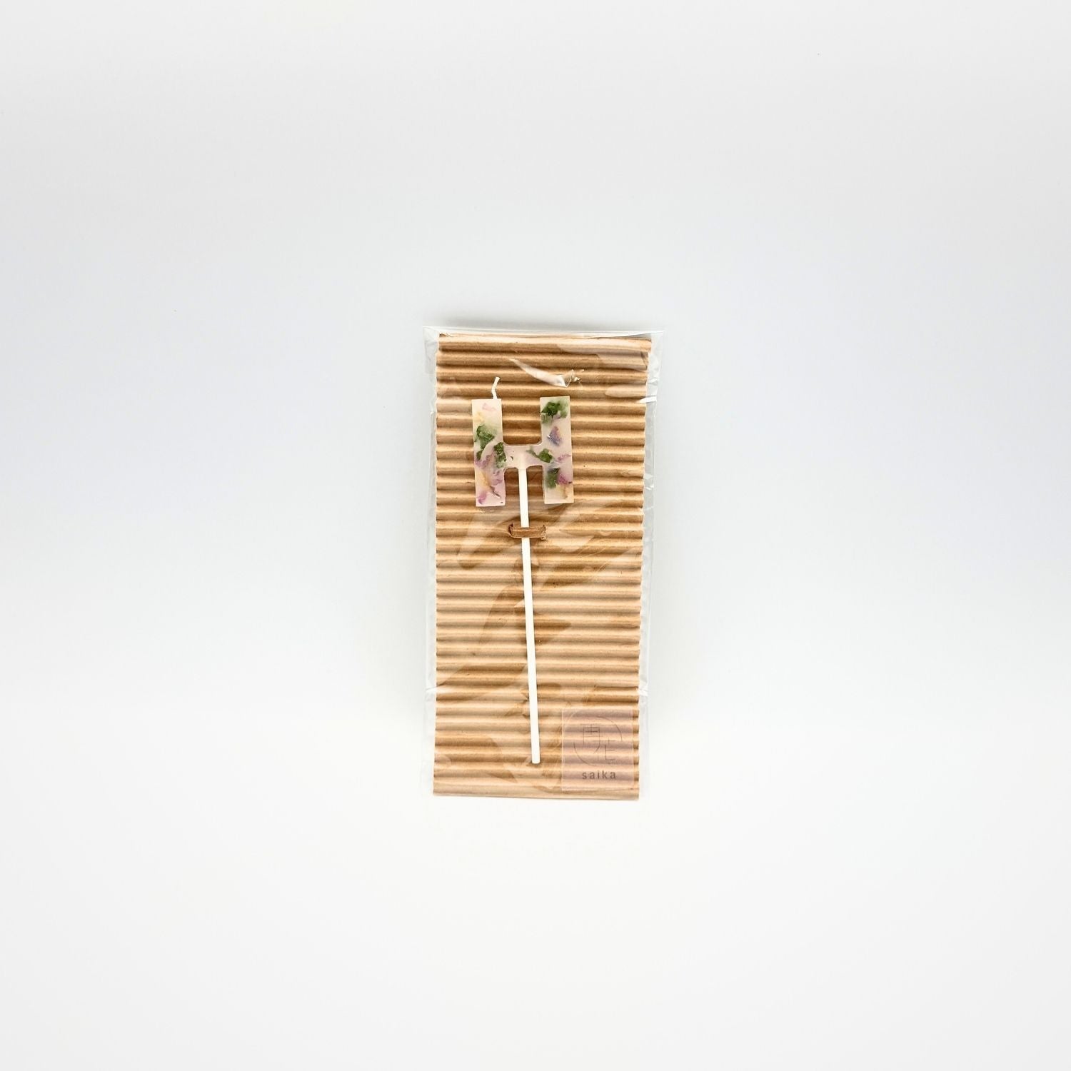 規格外や売れ残りなどの理由で、キレイに咲いているまま捨てられてしまう予定だった “ロスフラワー“ の花びらや葉や枝のかけらを集めて作ったロリポップ型のキャンドルです。