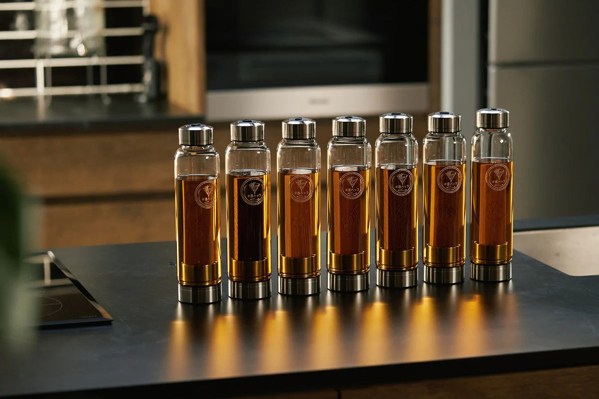 銘木をセットした専用ガラスボトルにお酒を注げば、なんと半日待つだけで、いつものお酒が樽で熟成したようなまろやかさと豊かな香りに。