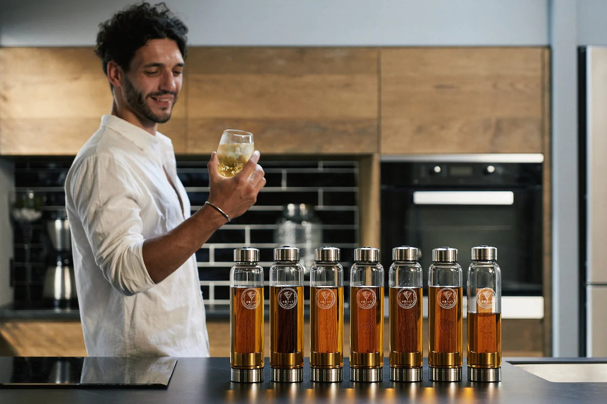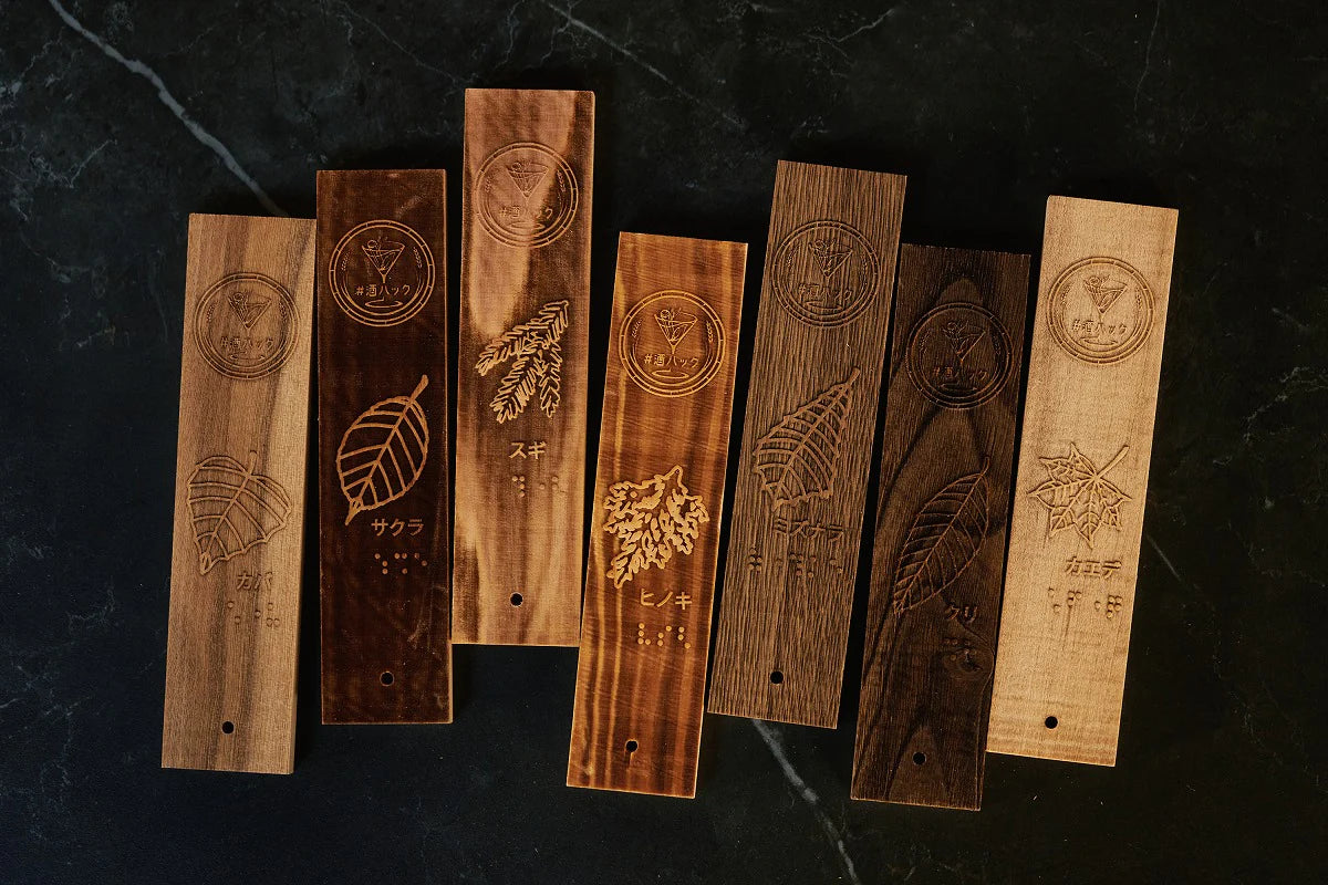 焼き上げ(チャー)した7種の国産銘木を専用ガラスボトルにセットし、いつものお酒を注ぐだけ。